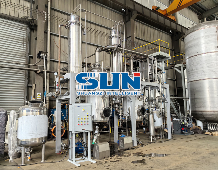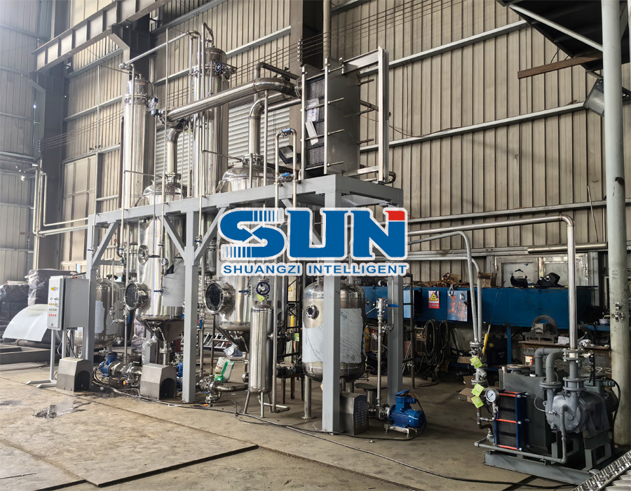 The workflow is divided into two-effect synergy: In the first-effect evaporator, the preheated material flows downwards in a thin film along the inner wall of the heating tube through a film distributor, while being heated by steam. The secondary steam generated by the vaporization of the solvent in the material is not directly discharged but is introduced into the second-effect evaporator as the heating source for the second effect. The second effect operates at a lower pressure, using the secondary steam from the one effect to continue heating the material and further vaporize the solvent. Finally, the steam generated by both effects enters the condenser for condensation and recovery, achieving "energy cascade utilization" and saving 40% to 50% energy compared to single-effect equipment.